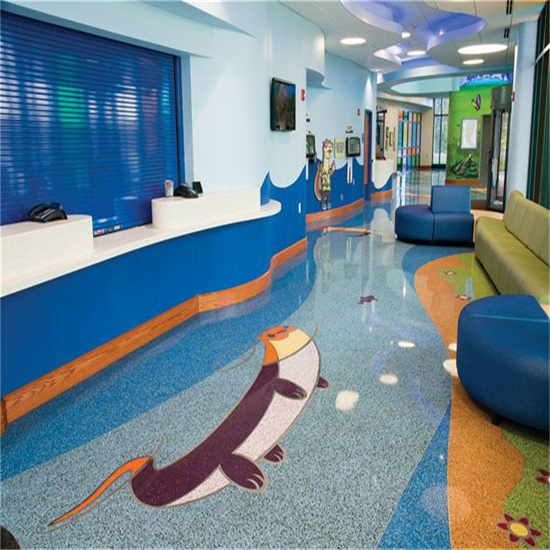 环氧磨石地坪是比较常见的一种磨石地坪,是商业场所的理想选择,如会议中心、医院、购物商场、酒店、宾馆等。它主要是由环氧树脂作为粘合剂,混合大理石、贝壳、石英石等骨料,进行复杂的工艺打磨抛光后形成的,由于采用的环氧树脂为有机材料,也称为有机磨石。环氧磨石地坪最大的卖点便是现场摊铺整体无缝,这一点在某些高级场所尤为重要。