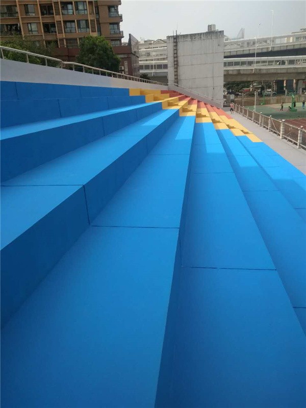 体育场看台地坪建议采用硬地丙烯酸材料,水性原料,无毒100%绿色环保产品,色彩鲜艳,不易老化,使用寿命长,耐候性好,颜色持久不褪,极佳的耐磨性、防滑性好,可提供多种颜色供客户选择,是室外看台地坪的材料!