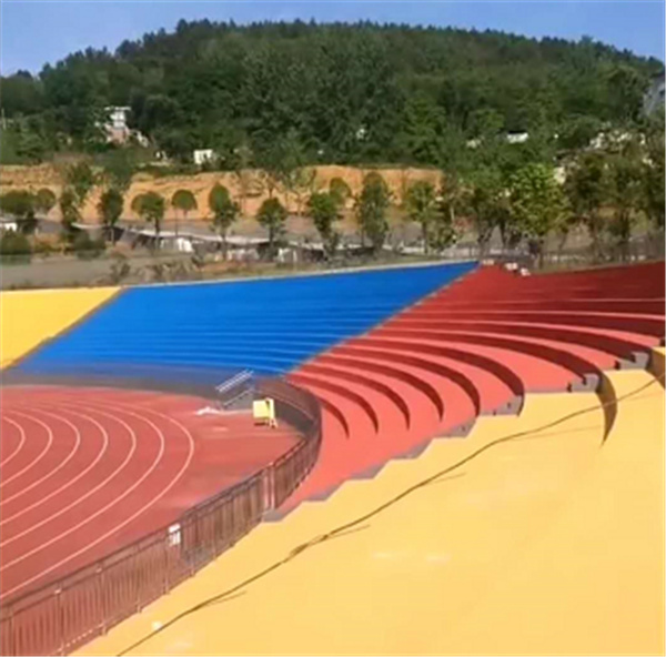 体育场看台地坪建议采用硬地丙烯酸材料,水性原料,无毒100%绿色环保产品,色彩鲜艳,不易老化,使用寿命长,耐候性好,颜色持久不褪,极佳的耐磨性、防滑性好,可提供多种颜色供客户选择,是室外看台地坪的材料!