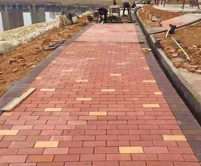3、铺设垫层。透水砖路面需要先在基层上铺设垫层,垫层所起到的作用主要是增强路面的强度以及耐久性,材料的要求上必须要兼具透水性和蓄水性。一般常用的垫层材料有级配碎石或者无砂混凝土,级配碎石的硬度高,强度比较好,铺设时大颗粒与垫层厚度的比例应该小于0.7,且大颗粒的直径也不可超过10厘米。如果选择无砂混凝土作为垫层,则直径应保持在5—10毫米之间,直径较大的颗粒所占比例不能超过35%,否则会对强度有所影响。将级配碎石或者无砂混凝土均匀铺上之后,还需要使用轮碾机来回碾压紧实。